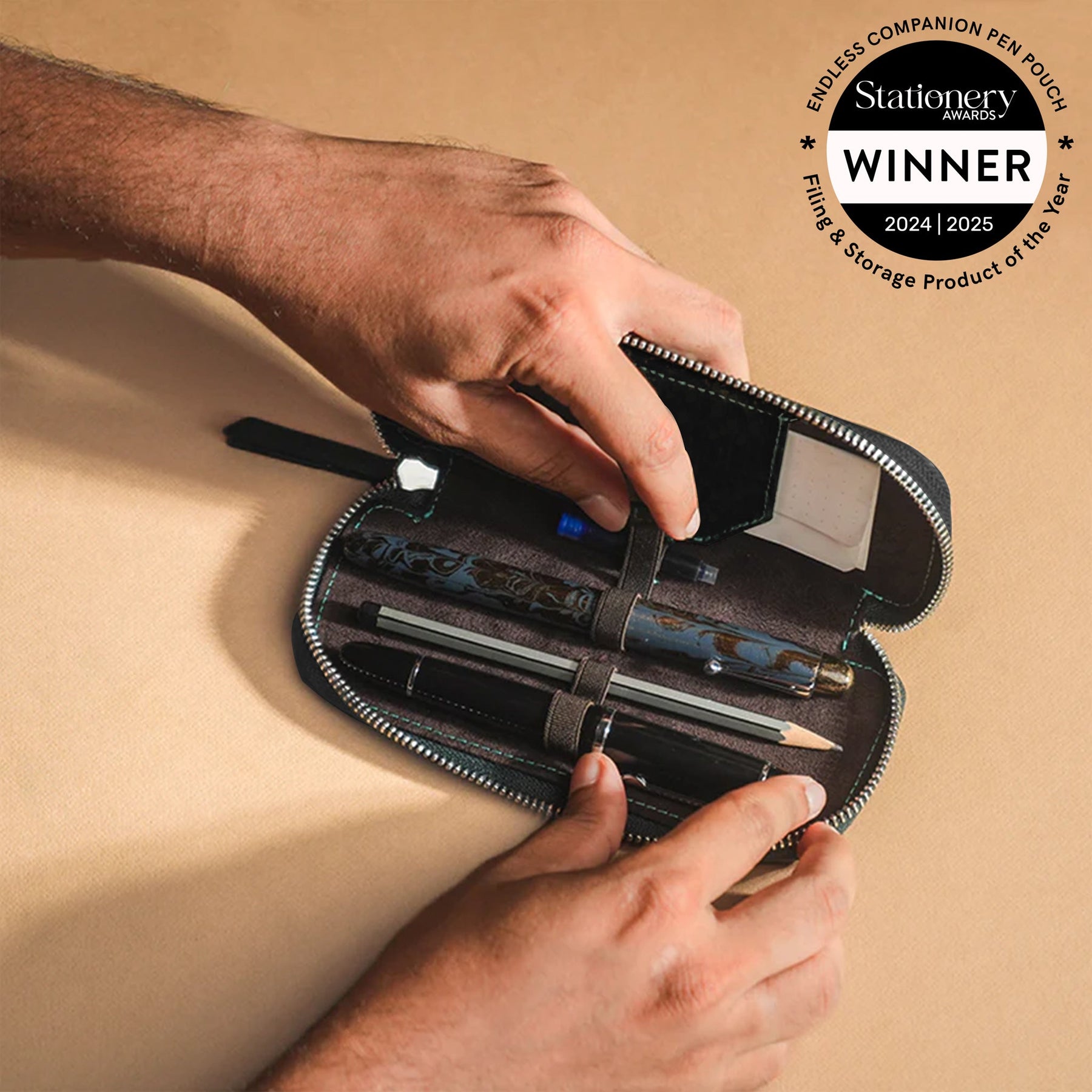 It has always been cumbersome to store pens of varying thicknesses in pen holders, until now. With our revolutionary Adjustable Elastic Band, you can store all your writing instruments snugly. In addition to the 3 Pen Slots, the Companion contains a dedicated slot for an additional refill/cartridge. The left side also includes a document flap with 3 slots for cards. Let the Companion take care of your tools, while you take care of creating!